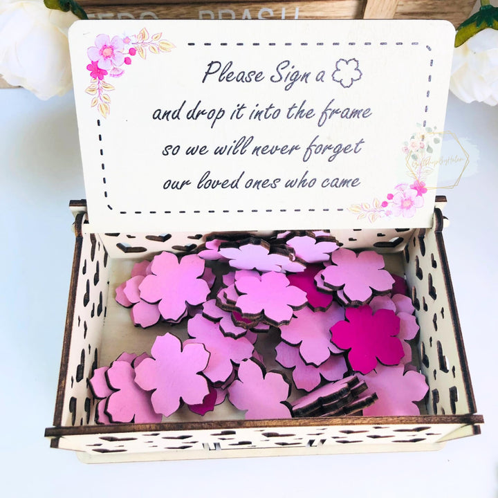 This gorgeous guest book can house every wish and blessing that your guests bestow upon your union. All they have to do is write everything down on small wooden hearts, sign their wishes, and drop the heart inside the frame.