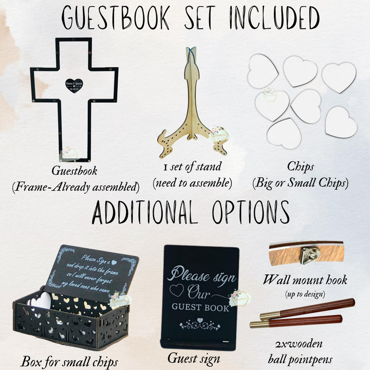 Christian Cross Guest Book Wedding Guestbook Alternative Personalized Wooden Cross for Wedding Baptism First Communion Church Guest Sign In Book Religious Keepsake with Wooden Hearts
