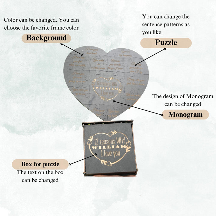 Details: Love is a beautiful journey, and sometimes, expressing our feelings can be as intricate and unique as the love we share. That's where our Heart Puzzle Box - "Reasons Why I Love You" comes in. This extraordinary creation is more than just a gift; it's a heartfelt expression of your love and affection. Heart Puzzle 12, 20, 28 or 38 reasons why I love you Crafted with care and precision, our Heart Puzzle Box is designed to captivate and delight. Each reason is a puzzle piece, waiting to be discovered and cherished. Quantity of reasons: + S - 12 Reasons (total heart size: 9.8 inch) + M - 20 Reasons (total heart size: 12.2 inch) + L - 28 Reasons (total heart size: 15 inch) + XL - 38 Reasons (total heart size: 20 inch) Size of box: + 4.7x4.7x3.1 for S,M + 5.9x5.9x3.9 for L, XL. This meaningful and romantic gift is the perfect way to celebrate love on any occasion. Whether it's an anniversary, Valentine's Day, or just an ordinary day when you want to show your love, our Heart Puzzle Box is a tangible testament to the depth of your feelings. With its elegant design and heartfelt sentiments, the Heart Puzzle Box is more than a gift; it's a declaration of your love. Embrace the art of expressing your affection in a unique and memorable way, and let your loved one know why you love them with every piece of this enchanting puzzle. It's a gift that will be cherished for a lifetime, a symbol of your love story, and a reminder of the reasons why your hearts beat as one. Pay Attention: That color and texture of wood can little differ from the listing presented on a photo. Each piece of wood has unique structure and texture. Total color of a product depends on it. You can choose the size, color, accessories in the options panel. Also settings of your monitor can influence a color rendition. Please place your order and customize the information. We will send you the design for your confirmation and further adjustments if needed. We wi