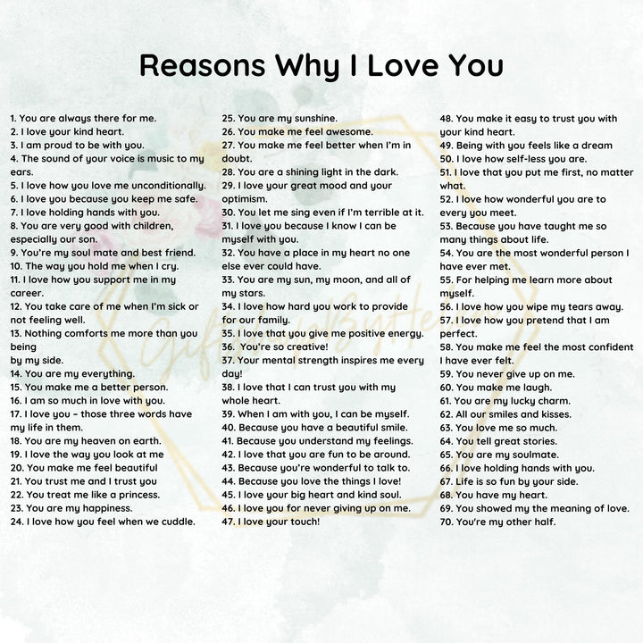 - We offer a variety of reasons for your reference, and you also have the option to customize them. Choose from sets of 12, 20, 28, or 38 reasons to express your love to your significant other.