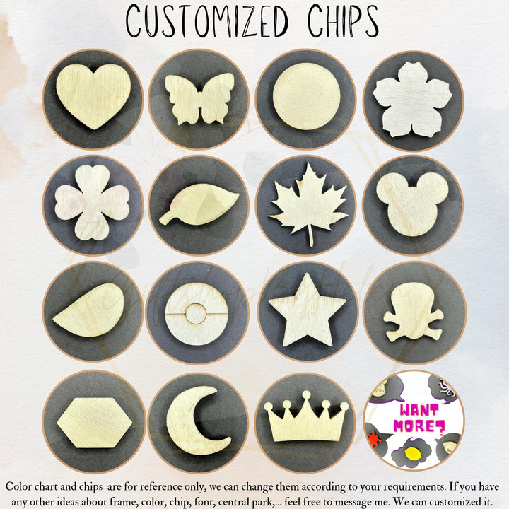 Details: Choose the size of the guest book depending on the number of guests at your party. The more hearts there are, the bigger the frame! Each guest will sign on a small wooden heart and put them inside the guest book to create a personalized keepsake. Package includes: - Guest book - Stand - Small chips - A box for small chips, sign and pen is optional. SIZE OF GUEST BOOK from 20 hearts up to 150 hearts (with Standard chip - Size of chips: 3 - 3.5cm. The size of the chip depends on the shape of the chip you choose) 5.5 x 9.8 inches (14x25cm) - 25 chips 6.7 x 11.8 inches (17x30cm) - 35 chips 7.9 x 13.8 inches (20x35cm) - 45 chips 9 x 15.7 inches (23x40cm) - 70 chips 10 x 17.8 inches ( 26x45cm) - 85 chips 11.8 x 19.7 inches ( 30x50cm) - 100 chips 13 x 21.6 inches ( 33x55cm) - 125 chips 14.6 x 23.6 inches ( 37x60cm) - 150 chips SIZE OF GUEST BOOK (with big chip - Size of chips: 4 - 6.2cm. The size of the chip depends on the shape of the chip you choose) 15.7" - 25 Big Chips 17.8" - 35 Big chips 19.7" - 45 Big Chips 21.6" - 55 Big Chips 23.6"- 70 big chips Pay Attention: That color and texture of wood can little differ from the listing presented on a photo. Each piece of wood has unique structure and texture. Total color of a product depends on it. You can choose the size, color, shape, accessories in the options panel. Also settings of your monitor can influence a color rendition.