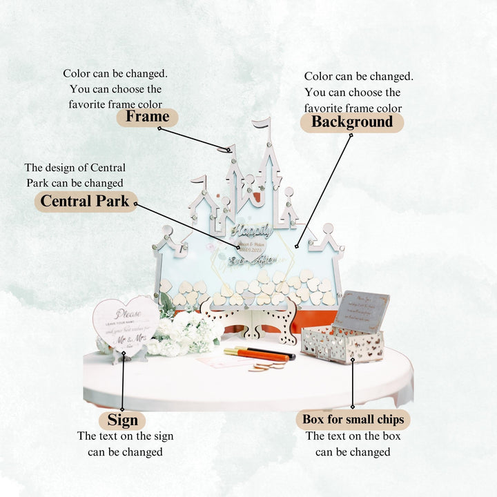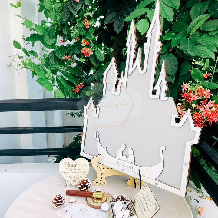 Customize Fantasy Castle Alternative Guest Book Drop Box, Personalized Fairy Tale Castle With Gondola Guestbook, Drop Box with Wooden Hearts For Wedding, Quinceanera, Birthday Celebration Decor