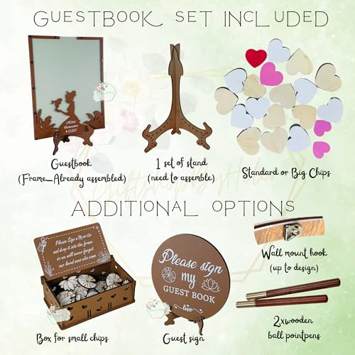 - 💌 Display with Pride – Instead of storing away pages, guests write on wooden hearts or chips and drop them into the frame, creating a stunning visual keepsake you’ll proudly display as home décor or a memory wall.