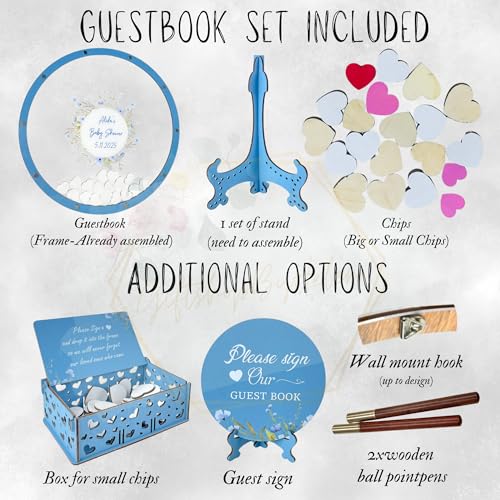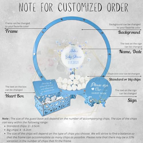- 💖[Easy to Customize]: Choose the size of the guest book according to the number of your guests. Add your names, your date, your color, choose chip shape, chip colors, and frame finish to match your party aesthetic. We create each product according to an individual order and take into account all customer wishes. So, the customer themselves configures the product as they wants.