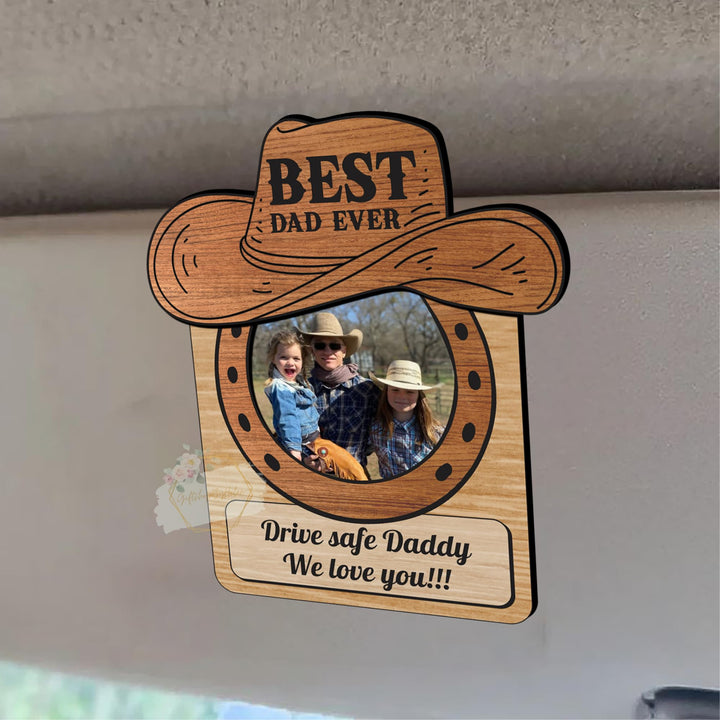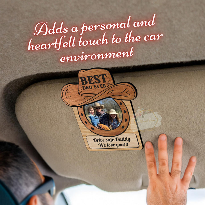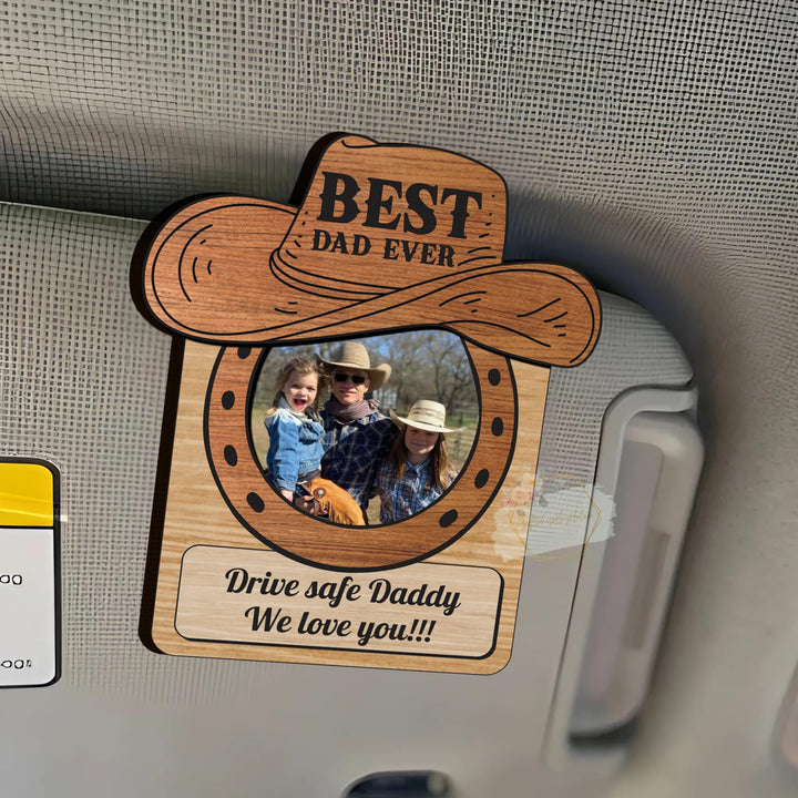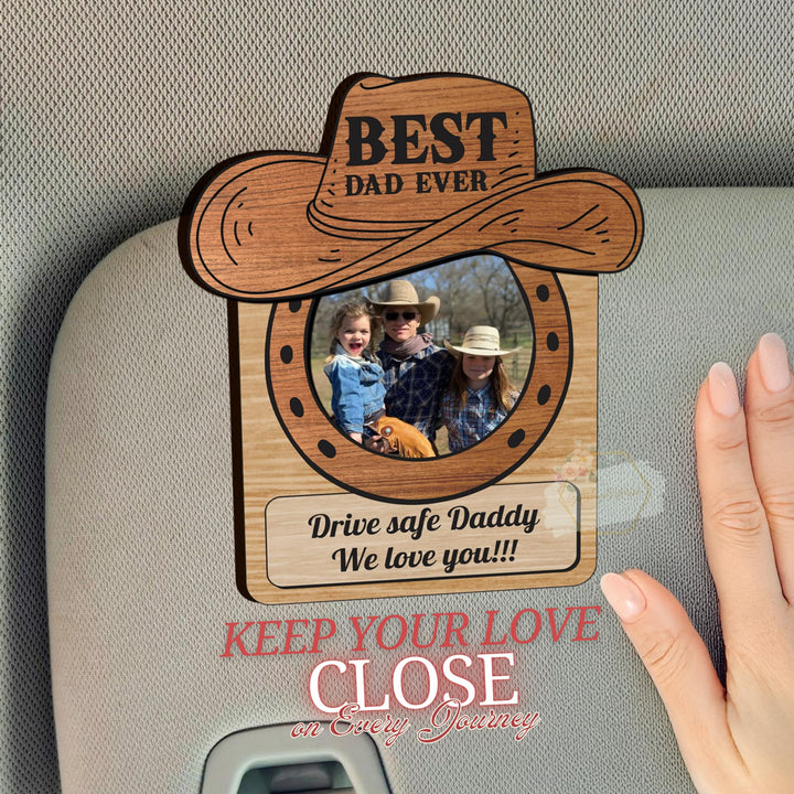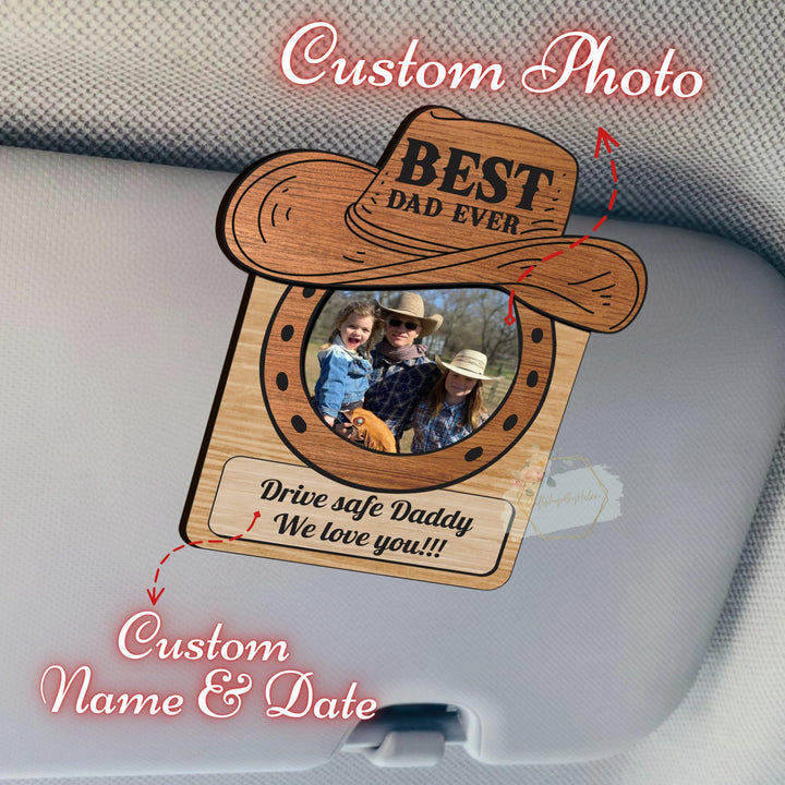 - Custom Cowboy Photo Clip for Car Visor: Slide in your favorite photo of dad or papa into this western-inspired car visor photo clip. Strong magnets and an acrylic face protect the image, creating a secure car photo frame with heartfelt flair.