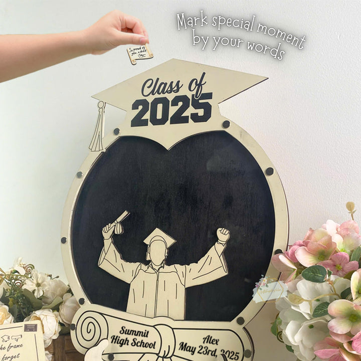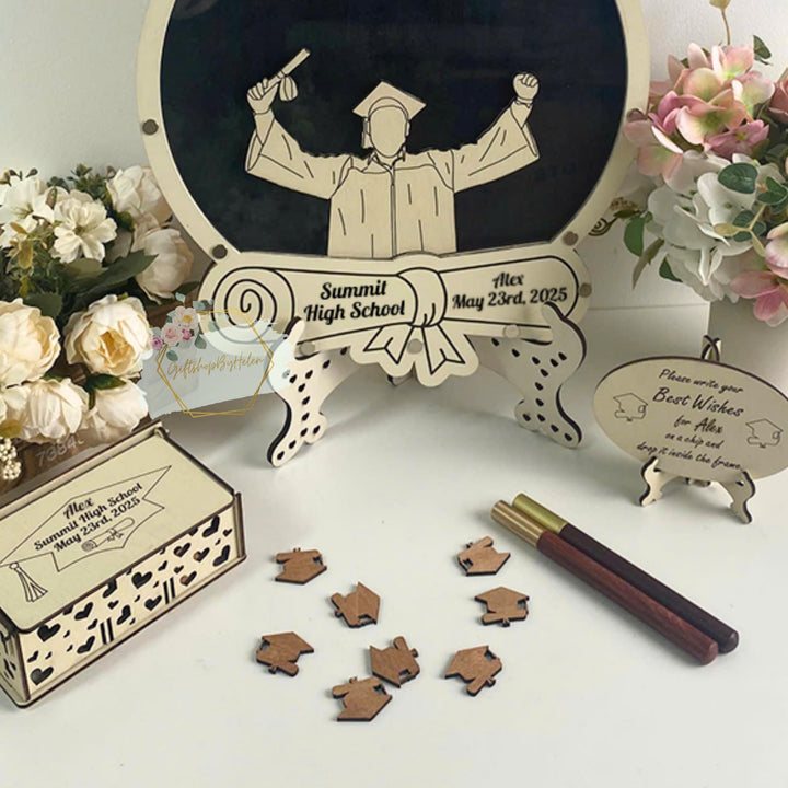 - [Unique Graduation Guest Book Alternative] Welcome your guests with this charming guest book alternative, features a custom graduation hat wooden frame with a natural wood background, making it the perfect way to capture blessings from your guests in style. This graduation cap shaped graduation guest book alternative is a unique and fun way to collect memories during your graduation party guest book 2025 celebration.