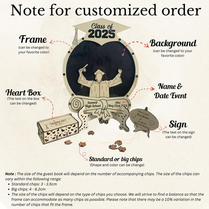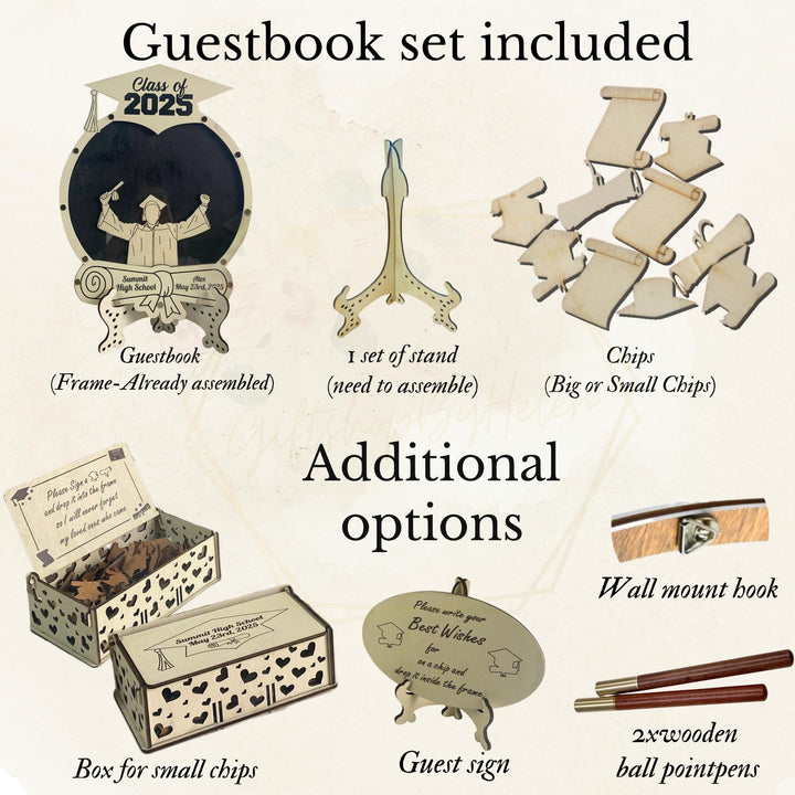 - [Easy to Customize]: Make it yours with this memory book alternative—click to customize names, dates, and chip shapes (like hearts) for up to 110 guests. This personalized guest book with a wooden guest book frame offers a personalized guest sign in that’s simple to tailor. Unlike typical guest book alternatives, this unique guest book blends any graduation party 2025 Decoration ideas with ease, ensuring your guest book matches your vision.