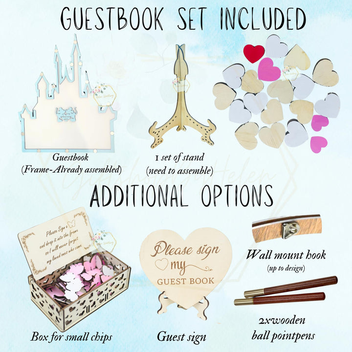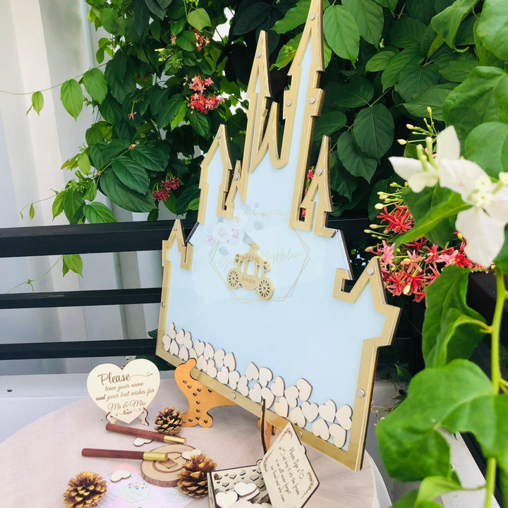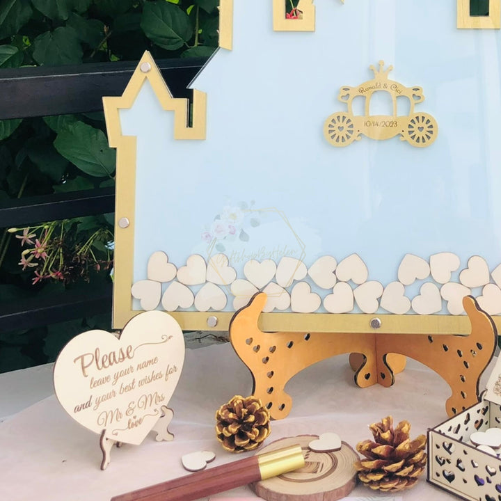 Personalized Wonderland Castle Wedding Guest Book Alternative, Customize Fairy Tale Castle Alternative Wedding Guest Book With Wooden Hearts For Wedding, Quinceañera, Birthday Celebration Decor