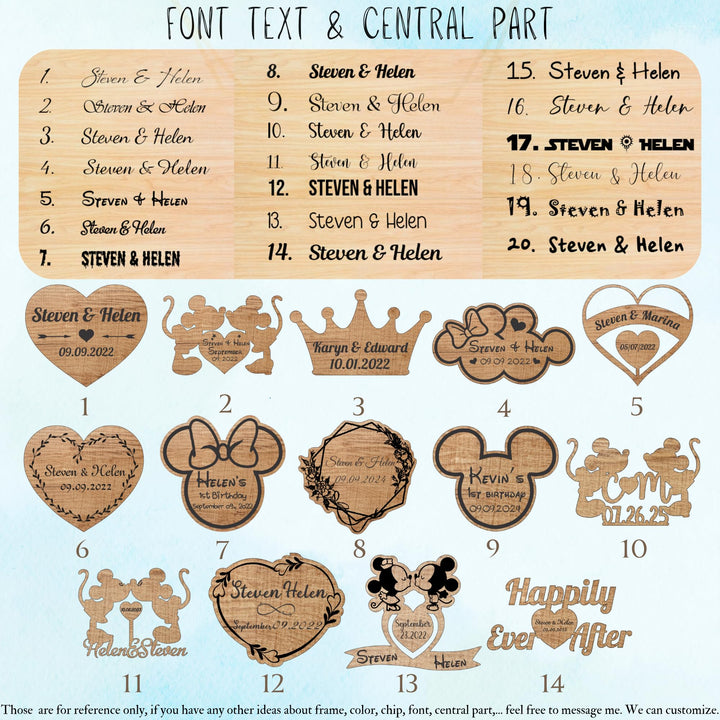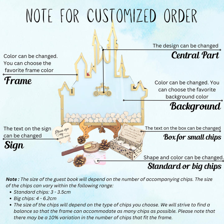 Details: Guest Book can range from house parties with family members to significant events the goal is to celebrate that the person is entering a different stage in their life. In this guest book, your guests can write personal messages to you sending their love and best wishes to you moving forward with your next chapter in life. This will be a place to keep memories of the messages that guests shared with you. After the party, you can use the frame as a decor in your home. Chip size will depend on the type of chip you choose. We have the following chip models: heart, butterfly, leaf, maple leaves, 5 leaf flower (cherry bloomson), pokemon, star, fish, circle, petal, sun, mouse, moon. The back frame is made from premium plywood or it can be clear with Acrylic and the front is finished with Acrylic. Each set includes: - Guest book -Stand - Small chips - A box for small chips is optional. The size of chips and guestbook depends on the number of chips. Size Of Guest Book (with Standard chip - Size of chips: 3.0cm - 6.0cm. The size of the chip depends on the shape of the chip you choose). Pay Attention: That color and texture of wood can little differ from the listing presented on a photo. Each piece of wood has unique structure and texture. Total color of a product depends on it. You can choose the size, color, shape, accessories in the options panel. Also settings of your monitor can influence a color rendition. We will send you the design for your confirmation and further adjustments if needed. We will proceed with the order if we do not receive a response from you after one day. Therefore, please check your messages regularly.