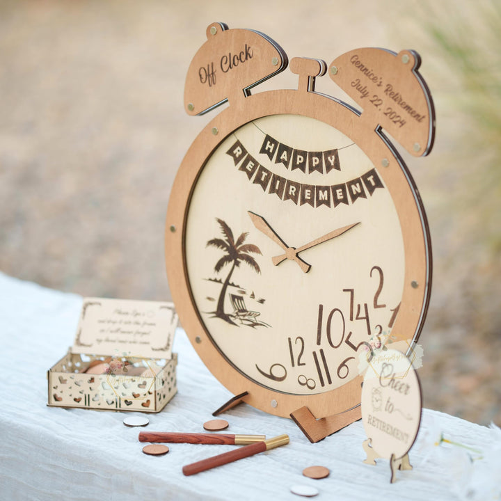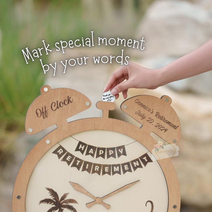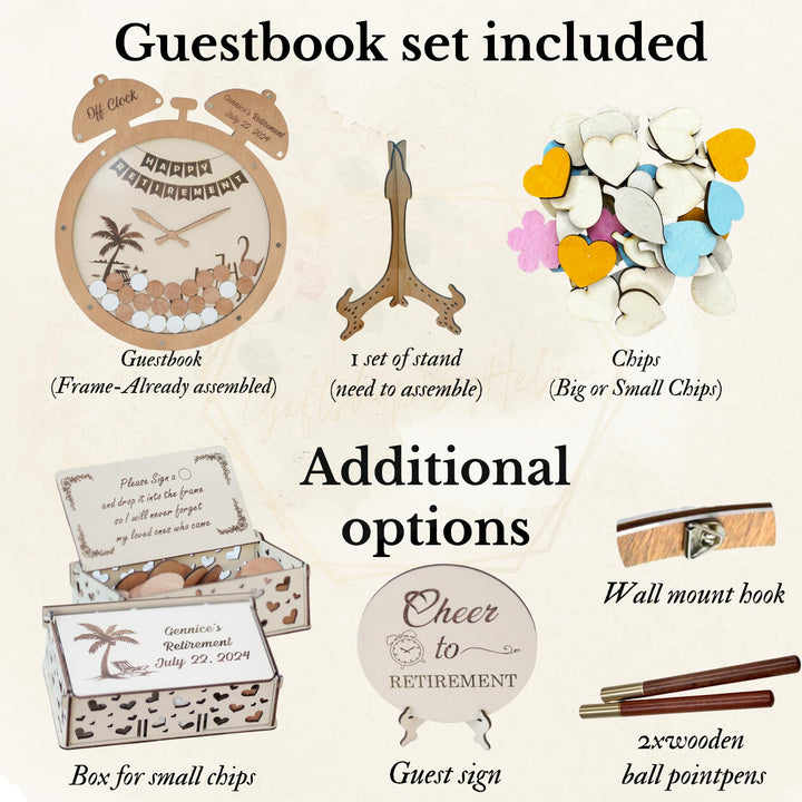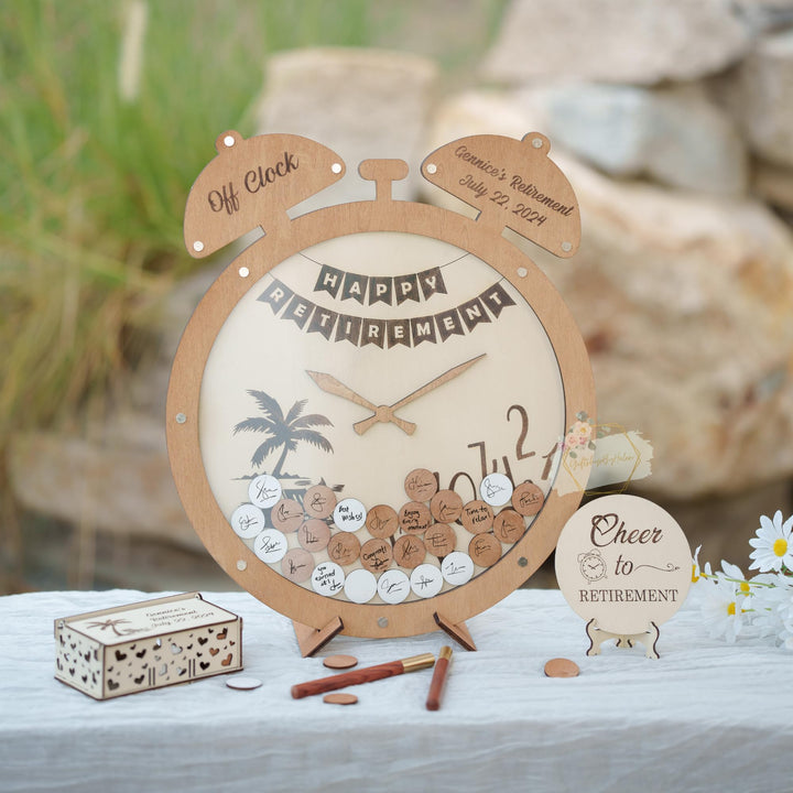 - 🕒 [Capture Your Special Day Uniquely]This clock-shaped retirement guest book alternative lets your guests sign wooden chips and drop them into a personalized frame—an unforgettable way to mark time and memories together.