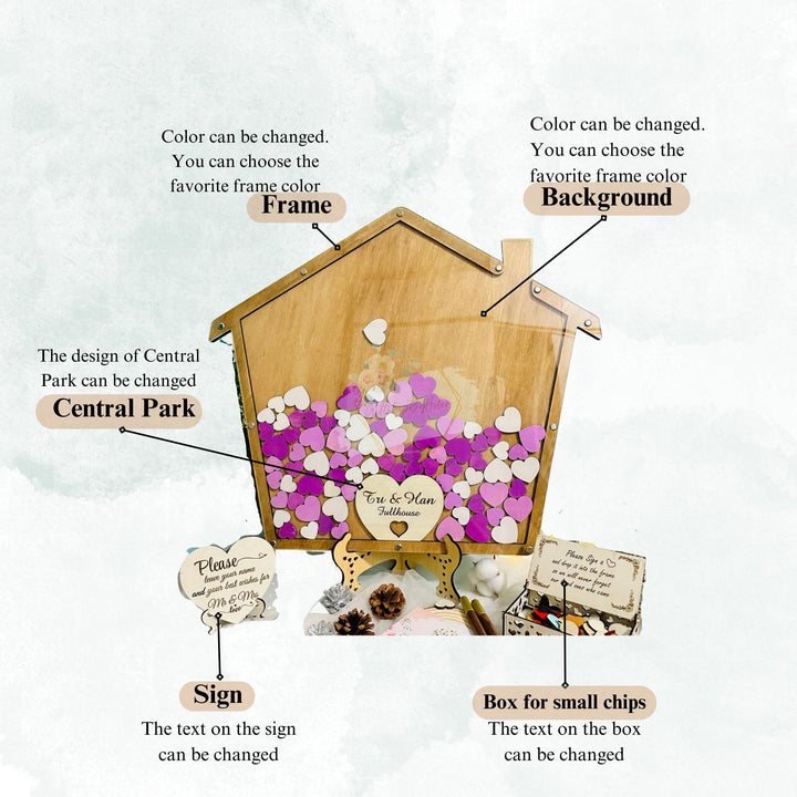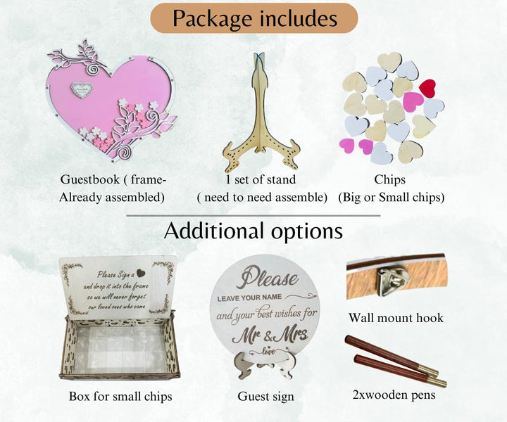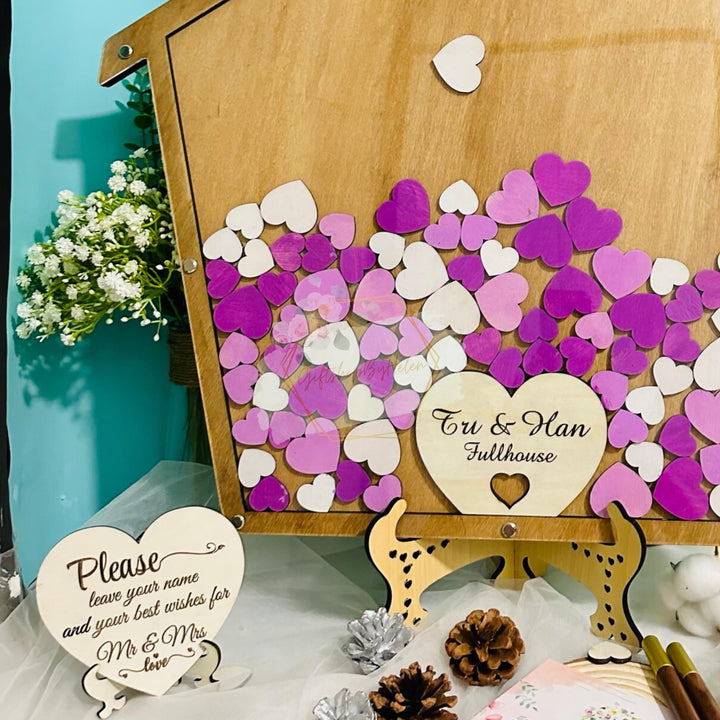 - Keep Your Wonderful Moment: Your guests leave their names or wishes in heart, and put them in the wedding message framework to record the individuals who shared in your celebration. After the event, you can use this message book to hang it on your wall to always remember all the people who are coming and all the beautiful memories created.