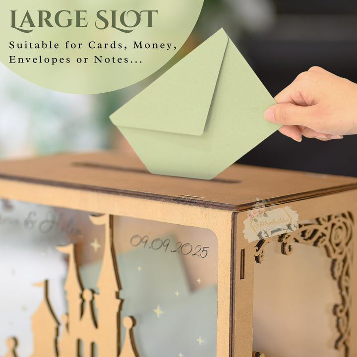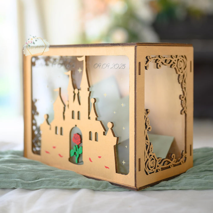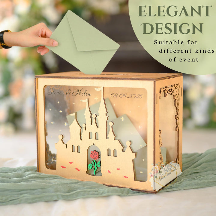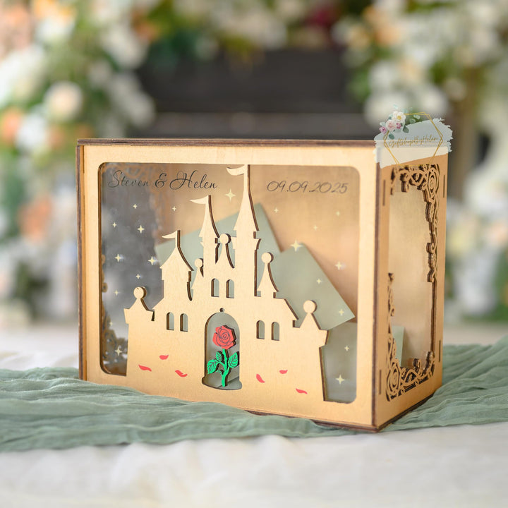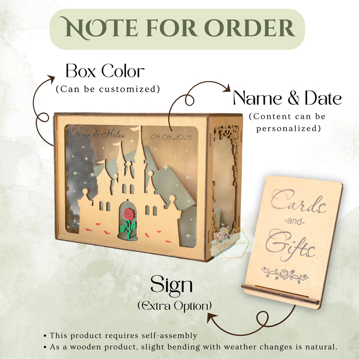 Wedding Card Box with Acrylic Window Custom Rose Castle, Wooden Gift Card Box for Wedding Reception Decorations, Money Newly Named Box Wedding for Party Birthday Rustic Wedding Decor